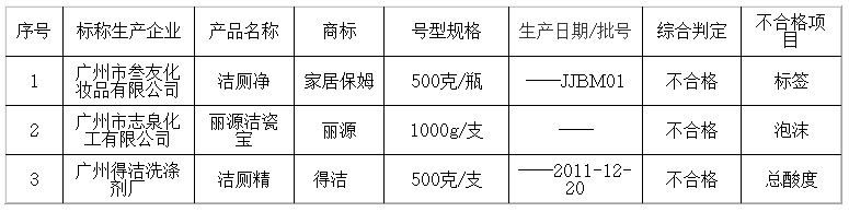 2012年廣州市衛(wèi)生潔具清潔劑質(zhì)量監(jiān)督抽查不合格產(chǎn)品及其企業(yè)名單
