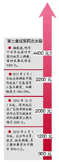 富士康將再次加薪!據(jù)報道,富士康計劃明年下半年將中國內地員工的薪水較現(xiàn)在水平再調高一倍,也預示著調薪后的中國內地富士康員工底薪將達4400元。如果消息屬實,這將是富士康從2010年以來,兩年時間里連續(xù)第四次加薪,而相比“跳樓事件”前900元的標準,富士康員工的薪水已經(jīng)翻了近五倍。有分析認為,隨著富士康兩年來接連多次提薪,