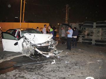 ????早報訊 拉著鋼管的自卸車左轉準備在路口掉頭,載著5名男女青年的白色豐田銳志轎車從后面疾馳而來,頂在自卸車的左后輪上,竟然將自卸車頂得側翻,油箱破裂,柴油流了30多米長。前天夜里8時20分左右,兩輛120救護車緊急趕到松嶺路朱家洼路段,5名傷者已經從扭曲變形的豐田轎車內爬出,隨即被分別送往青醫(yī)附院東部醫(yī)院和骨傷醫(yī)院急救。