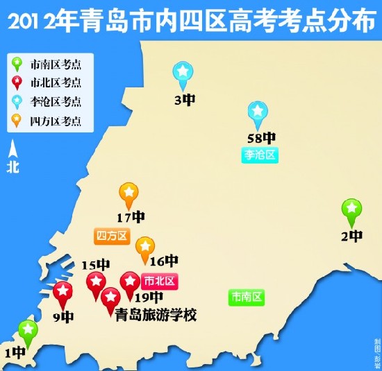 ????2012年,青島市內(nèi)四區(qū)共設(shè) 10個考點,市南區(qū)的考點為青島1中 、青島2中,其中 1中為文科考點,2中為理科考點;市北區(qū)的考點為青島9中 、青島15中、青島19中和青島旅游學(xué)校,其中,19中為普通文科考點,9中和15中為理科考點,青島旅游學(xué)校為藝術(shù)文考點;四方區(qū)考點為青島16中和青島17中,其中,16中為理科考點,17中為文科考點;李滄區(qū)的考點為青島3中和青島58中,其中 ,3中為文科考點,58中為理科考點。