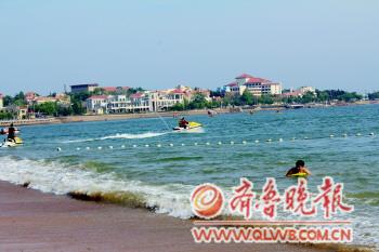 ????23日下午3點(diǎn)左右,記者在一浴看到只有西側(cè)幾十米寬的海域供人游泳,浴場和快艇