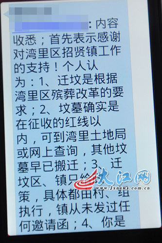 “我們兄妹憤怒的是,整件事情,我們沒有收到一份與遷墳有關(guān)的正式文件或者公函,招賢鎮(zhèn)沒有一份蓋公章的文件給我們。”王迪薇說,他們唯一看到的是灣里區(qū)農(nóng)村殯葬改革辦“致廣大村民朋友們的一封信”。王迪薇表示,殯葬改革也好,社會新農(nóng)村建設(shè)也好,整頓市容也好,只要證明是政府行為,他們都支持。王迪薇兄妹想不明白的是“你既然是政府行為,你為什么不發(fā)一個公函來?”“我們家后輩眾多,我們要給大家傳真公文,告訴大家‘小家服從大家’?!蓖醯限闭f,遷祖墳的事全家人都非常重視,10個兄弟姐妹都說開舊墳的時候全部都要到場,“現(xiàn)在這個情況,我都沒法跟他們交代?!?/p>