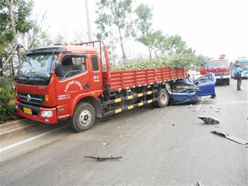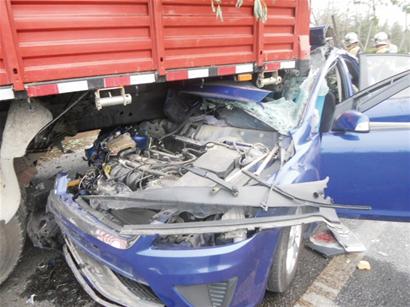 ????“我剛才開車送客人去機(jī)場,路過環(huán)灣路與瑞昌路路口北500米處時(shí),看到一輛寶石藍(lán)色的福特轎車撞在一輛紅色的卡車尾部,聽說有孩子被困在車內(nèi)。”昨天下午4時(shí)50分左右,出租車司機(jī)王先生撥打早報(bào)熱線82888000稱。記者聞?dòng)嵹s到現(xiàn)場時(shí)看到,一輛消防特種救援車停在南向北車道的路邊,一輛紅色的卡車右前輪騎上路邊綠化帶,一輛寶石藍(lán)色的福特轎車將近半個(gè)車身撞進(jìn)了卡車尾部,發(fā)動(dòng)機(jī)蓋翹起,前擋風(fēng)玻璃完全破碎,車身碎片甩到了車前三四米處,警車和120救護(hù)車也趕到了現(xiàn)場,目擊者王先生指著嚴(yán)重扭曲變形的副駕駛位置稱,一名8歲的小女孩還被卡在座位上。