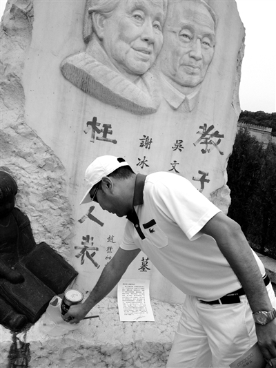 介紹完情況后,張鐵軍帶領記者到冰心紀念碑查看現(xiàn)場情況。爬上幾段階梯之后到達一個群山擁抱的高聳平臺,平臺上有數(shù)位文化名人的紀念碑,如夏衍、田漢、葉圣陶、曹禺等文學巨擘,平臺四周重巒疊翠,草木蔥蘢,蔚然生秀。冰心、吳文藻夫婦的紀念碑位于平臺的最后一排,上面留有油漆刷上的鮮紅的大字“教子無方 枉為人表”,與四周典雅靜謐的環(huán)境顯得格格不入。