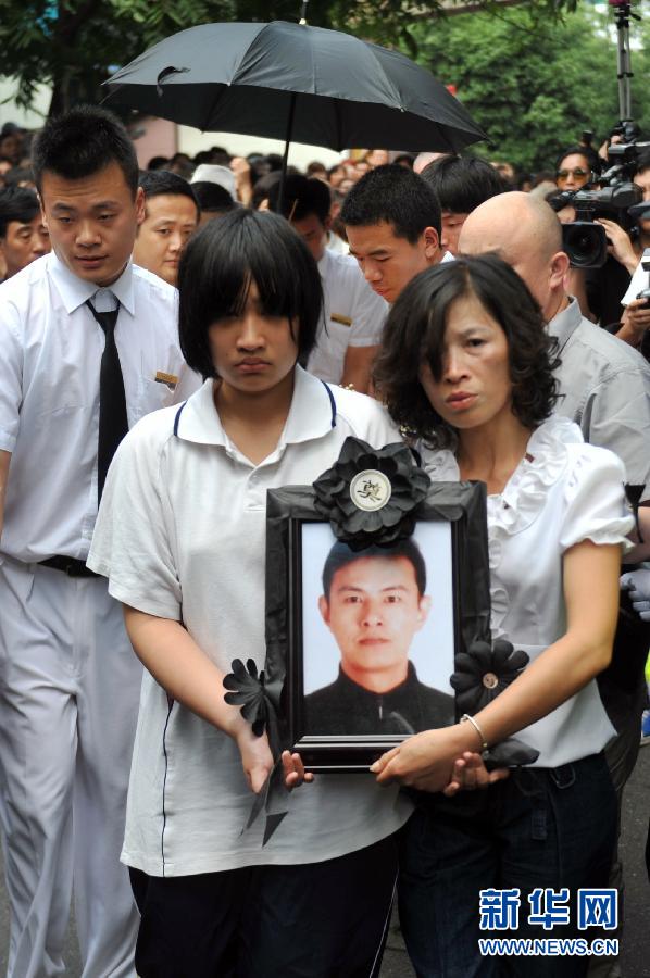 6月4日,吳斌的家人手捧親人的遺像準備出殯。