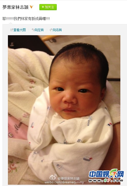 6月6日晚,林志穎在微博上傳一張嬰兒照片,林志穎稱(chēng)林家有了新成員。此微博一發(fā)馬上引起粉絲轟動(dòng),粉絲紛紛猜疑這個(gè)嬰兒的身份,有粉絲稱(chēng)是林志穎的小兒子,kimi的弟弟。有粉絲說(shuō)近期沒(méi)有志穎嫂懷孕的消息,這個(gè)嬰兒可能只是家族成員的小孩。面對(duì)眾多好奇的粉絲,林志穎至今沒(méi)有公布正確答案。