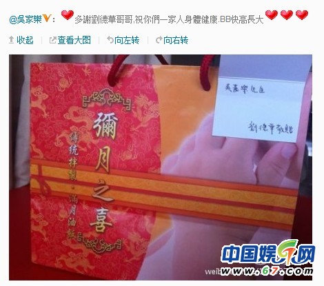 6月7日,TVB藝人吳家樂在微博上傳一張劉德華女兒彌月之喜的禮盒,禮盒里是傳統(tǒng)的滿月油飯,禮盒上印有劉德華女兒可愛的小手照片。吳家樂在微博中感謝劉德華,祝劉德華一家人身體健康,寶寶快高長大。劉德華粉絲大贊偶像的心意,還紛紛求小龍女照片曝光。