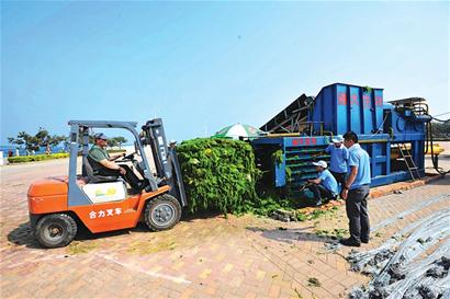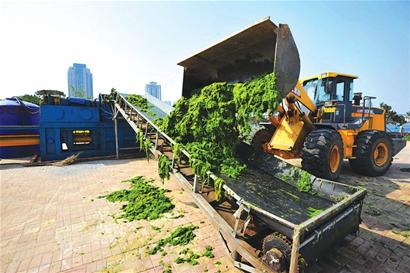 ????堆積成山的滸苔經(jīng)過(guò)脫水、打包,變成一塊塊重約三噸的“滸苔餅”,昨天上午記者在八大峽碼頭看到,兩臺(tái)滸苔壓縮機(jī)已經(jīng)提前啟動(dòng),日處理量可達(dá)1000噸。記者了解到,滸苔距青島僅19公里,我市嚴(yán)陣以待,已啟動(dòng)三臺(tái)壓縮機(jī),壓縮后的“滸苔餅”將被運(yùn)到加工廠,烘干后可制成飼料和有機(jī)肥。