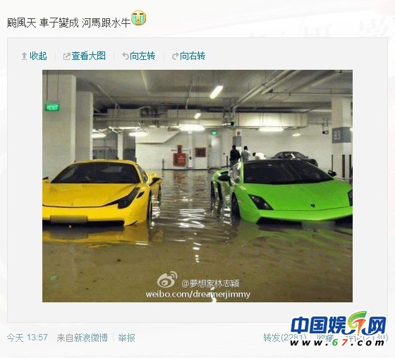 林志穎今日下午在微博曝自家車庫被淹畫面,照片中他的兩臺(tái)豪車均已被暴雨浸泡。