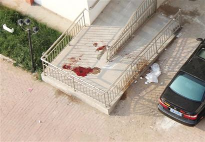 ????記者接到線索趕到事發(fā)地時,警方在樓下設(shè)置了100多米長的警戒線,旁邊停著6輛警車,20多名民警在現(xiàn)場勘查,其中10多名民警上到了16層樓頂。記者爬到對面樓上查看,發(fā)現(xiàn)55號樓頂刑警正在勘查現(xiàn)場。一對中年夫婦在向他們講述事發(fā)經(jīng)過。記者在高處看到,一名穿著黑色衣褲的男青年頭朝北腳朝南,面朝下,趴在該樓樓梯出口前的過道上,鮮血從他頭部流出,旁邊過道的不銹鋼扶手也被砸凹陷,13樓的防盜窗也被砸得歪斜。