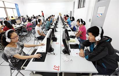 正式開(kāi)考后,每個(gè)考生都對(duì)著電腦屏幕大聲地朗讀,整個(gè)教室里頓時(shí)變得嘈雜起來(lái),不過(guò)由于戴著隔音耳機(jī),考生相互之間并不受干擾。