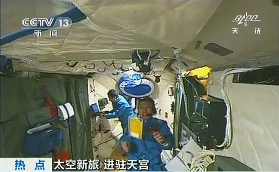 天宮一號與神舟九號組合體20日晨6時許“轉(zhuǎn)正飛行”,從交會對接的倒飛狀態(tài)進入正常的飛行,形成天宮在后正飛,飛船在前倒飛的飛行模式,這也是組合體的標(biāo)準(zhǔn)飛行姿態(tài),為第二次交會對接做好準(zhǔn)備。圖為航天員劉旺在天宮旋轉(zhuǎn)物品。(電視截圖)