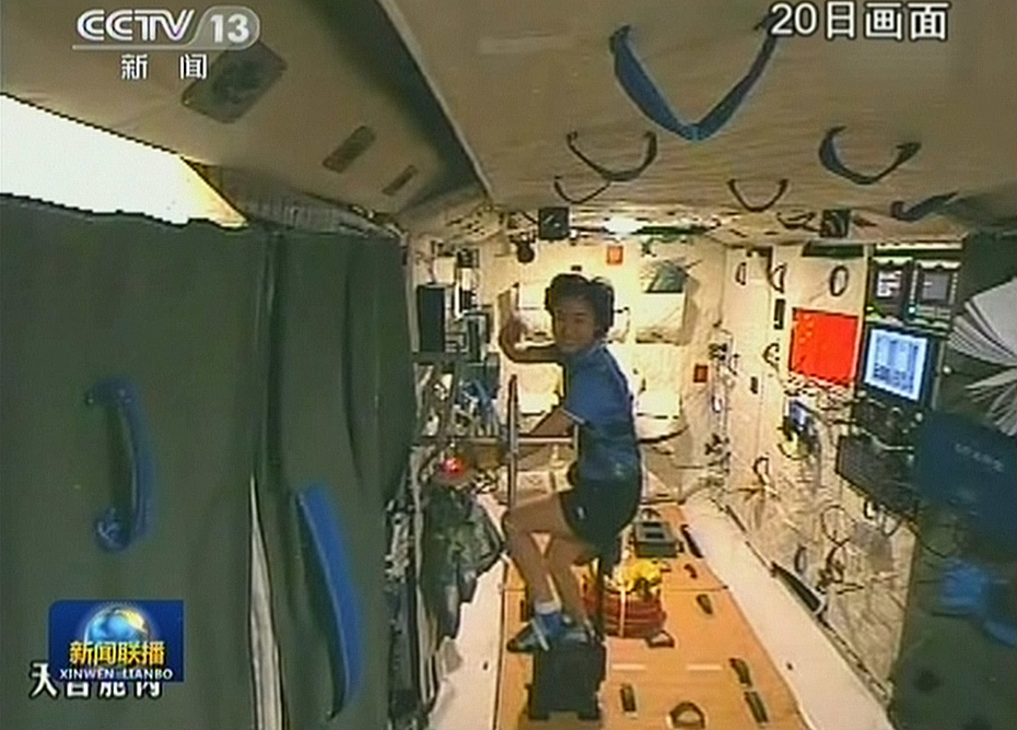天宮一號與神舟九號組合體20日晨6時許“轉(zhuǎn)正飛行”,從交會對接的倒飛狀態(tài)進入正常的飛行,形成天宮在后正飛,飛船在前倒飛的飛行模式,這也是組合體的標(biāo)準(zhǔn)飛行姿態(tài),為第二次交會對接做好準(zhǔn)備。圖為女航天員劉洋在天宮內(nèi)騎單車。(電視截圖)