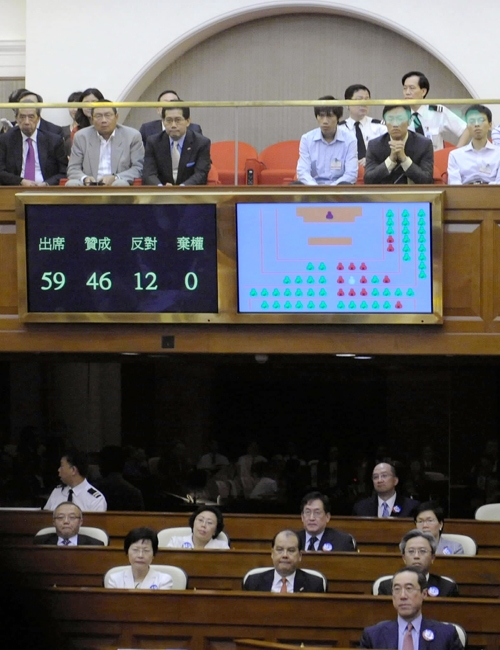 ????2010年6月25日,香港特區(qū)立法會(huì)以超過(guò)全體議員三分之二多數(shù)投贊成票的結(jié)果,表決通過(guò)了關(guān)于2012年立法會(huì)產(chǎn)生辦法的修訂議案。 圖為2010年6月25日拍攝的關(guān)于2012年立法會(huì)產(chǎn)生辦法的修訂議案的表決結(jié)果。(新華社記者 黃本強(qiáng) 攝)