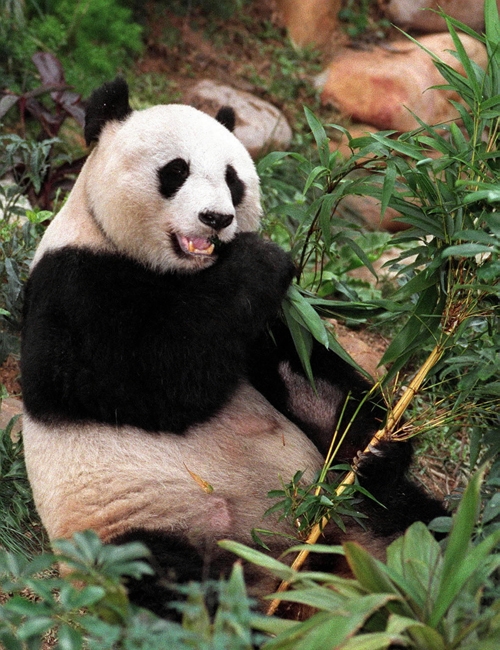 ????1999年5月17日,香港海洋公園大熊貓園開幕,內(nèi)地贈港大熊貓“安安”“佳佳”喜遷新居。隨后十余年,這對憨態(tài)可掬的熊貓明星,陪伴香港市民尤其小朋友度過無數(shù)歡樂時(shí)光,每年吸引訪客逾160萬。 圖為1999年5月17日,21歲的大熊貓“安安”在香港海洋公園大熊貓園里吃竹子。(新華社記者 魚瀾 攝)