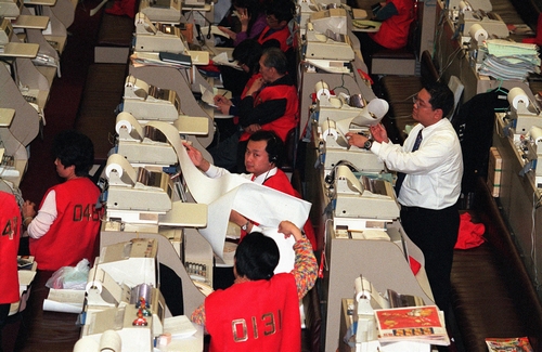 ????1998年8月28日,恒指期貨合約結(jié)算日,港股締造傳奇的一天。特區(qū)政府投入巨額資金,與國際炒家開展將近一年的“金融保衛(wèi)戰(zhàn)”,終在收盤鐘聲響起那一刻,宣告獲勝。 1998年2月2日,香港股市交易員在忙碌。當(dāng)日,香港股市在虎年第一個(gè)交易日出現(xiàn)紅盤。(新華社記者 張燕輝 攝)