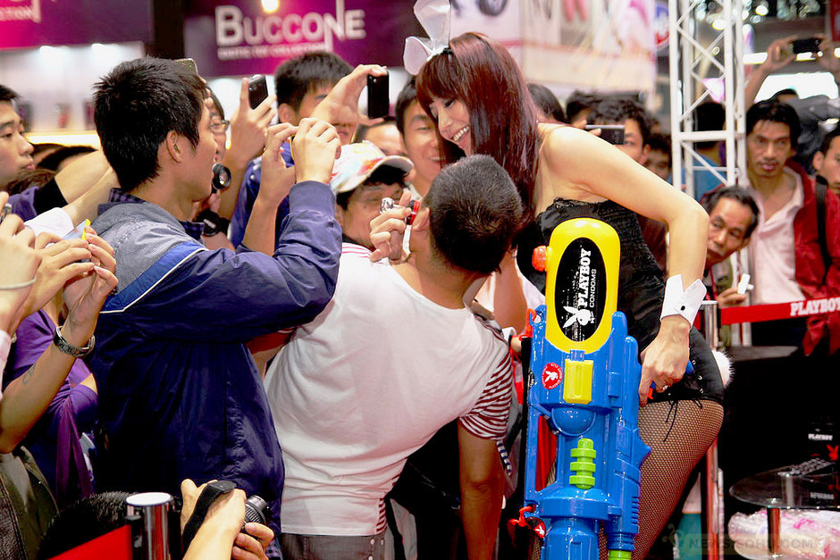 和車展上的裸模相比,性文化展上的裸體模特要顯得理直氣壯許多,觀眾的眼神也要放肆許多。來自車展與性文化展中觀眾視線,更多地成分是焦渴,這個擁有悠久性禁錮歷史的民族,史無前例可以在如此寬松的環(huán)境談論性、探索性、分享性,并且在這過程中體會到前所未有的自由感受,在因禁錮變得敏感而容易受傷的心靈面前,裸露的身體提供了藥劑一般的安慰。圖為2011年11月12日,廣州性