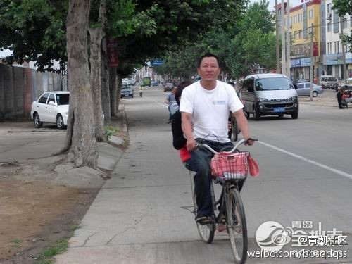 7月16日 楊師傅到膠南看望陳琪,他借了輛網(wǎng)友的自行車,載著陳琪逛膠南的大街。