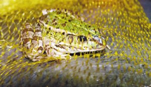 直至上午11點(diǎn)30分,在一家名為“明禮水產(chǎn)經(jīng)營(yíng)部”的攤位前,兩名女老板見(jiàn)有人詢(xún)問(wèn),便抖動(dòng)著裝滿(mǎn)田雞的編織網(wǎng)熱情地招呼著顧客,她們表示這批田雞剛剛送來(lái),是附近農(nóng)民從野外抓到后賣(mài)給她們的。這些田雞個(gè)體大小不一,但大部分的膚色為綠色,體型比牛蛙小很多。