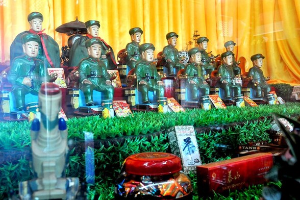 圖為解放軍烈士廟正殿供奉著27尊身著武裝的解放軍雕像。