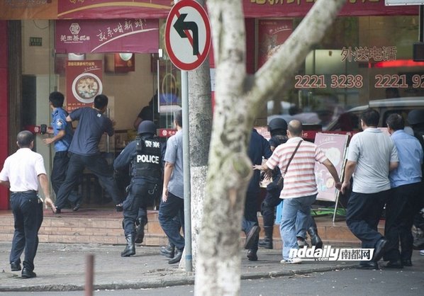 據(jù)莞園餐廳的員工說,當時餐廳里共有7個人,其中一對母女正在餐廳中間的桌子上吃飯,其余的則是餐廳的員工?!皺M條衫男子沖進來之后,直接將手中的工具啪的一聲放在桌子上,尖尖的那頭對著五六歲大的小女孩,嚇得母女倆動也不敢動”,員工們見狀立即跑了出來“這個過程男子沒有說任何話,也沒提任何要求,只是望著母女倆。”