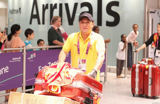 ????倫敦時間7月23日訊? 中國羽毛球隊(duì)乘坐CA937航班于倫敦時間7月23日下午抵達(dá)倫敦,晚上18點(diǎn)左右,中國羽毛球隊(duì)總教練李永波和隊(duì)員們推著行李車依次走出通道。雖然是長途飛行,但他們看上去心情很好,跟守候在一邊的中國媒體揮手打招呼。