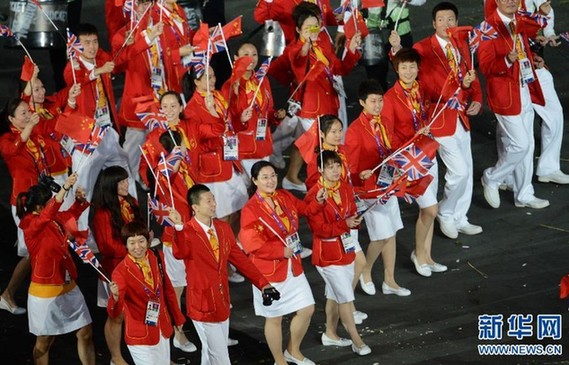 7月27日,第三十屆夏季奧林匹克運(yùn)動(dòng)會(huì)在英國(guó)倫敦開幕。圖為中國(guó)代表團(tuán)在開幕式上入場(chǎng)。