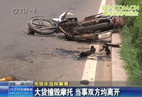 今天上午11點45分前后,城陽汽車北站以北300米處發(fā)生一幕慘劇,一輛高速行駛的集裝箱大貨車與內道的一輛摩托車相撞,目擊者稱,摩托車駕駛員可能當場被擠死了。12點55分,記者趕到事發(fā)地,看到肇事的集裝箱大貨車仍停在路邊接受調查,不過8分鐘后,大貨車就在警車的帶領下一路向北駛離,現(xiàn)場只剩下另外幾個人。在大貨車內道的路面上,躺著一輛被撞壞的摩托車,地上除了有一些零碎的車部件,還有大攤鮮紅的