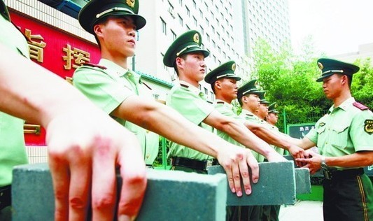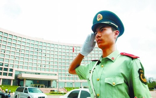 市政府門口的崗哨,武警戰(zhàn)士每天風雨無阻地在這里執(zhí)勤站崗,期間必須保持一個姿勢,一動不動,滿頭大汗都不能擦。