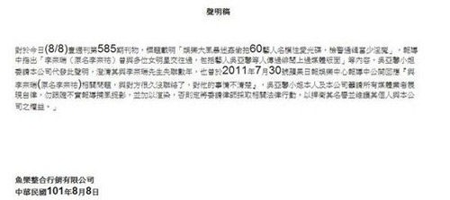 昨日(8月8日)臺(tái)灣周刊爆出臺(tái)灣知名富二代李宗瑞迷奸偷拍案,曾與他交往過的藝人吳亞馨也被牽扯其中,吳亞馨的經(jīng)紀(jì)公司特地發(fā)出聲明表示,希望其他媒體勿捕風(fēng)捉影加以報(bào)導(dǎo),否則將采取法律行動(dòng)。