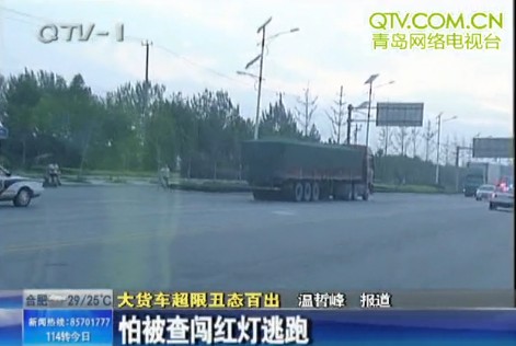 ????可大貨司機(jī)做賊心虛,不顧十字路口紅燈閃亮,急速闖燈后沿馬路逆行逃跑。由于此時(shí)過路車輛較多,執(zhí)法人員只能在外圍追隨,最終在5公里外的一段公路上將貨車逼停。晚上10點(diǎn)