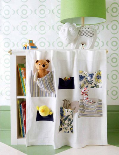 現(xiàn)成的較長的布簾剪成合適的長度,掛在書架前擋灰塵。別忘記在簾子正面縫些彩色布口袋,充滿樂趣。