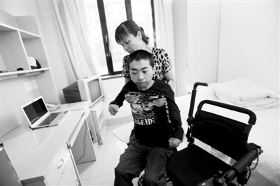 昨日,新生矣曉沅在媽媽的幫助下活動(dòng)。20歲的云南考生矣曉沅,成了清華十年來的第一個(gè)“輪椅新生”