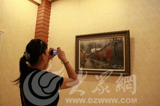 采訪團成員在青島綠澤油畫國際展覽交易中心里參觀。(記者 張帆攝)