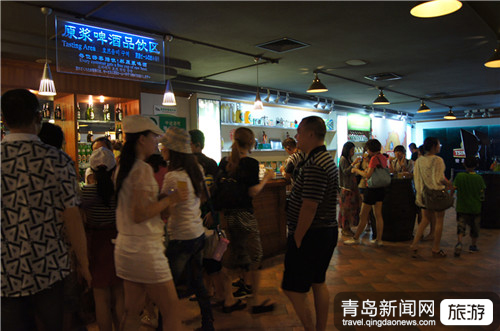 ????記者在原漿啤酒飲酒區(qū)看到,很多游客從B館出來之后,紛紛加入到了排隊領(lǐng)酒的隊伍中,然后圍在吧臺區(qū)就著啤酒豆喝著鮮香醇美的原漿,不時的發(fā)出美味的贊許聲。記者隨后來到一樓多功能區(qū)域的品酒區(qū),在這里游客依舊可以憑借門票免費領(lǐng)取一杯青島純生啤酒,只見結(jié)伴而來的游客們圍坐在桌前,舉杯歡呼一飲而盡,現(xiàn)場的氣氛頓時活躍起來。