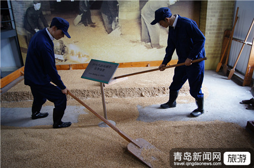 ????行至B館,陳舊偏暗的色調(diào)瞬間將游客帶回來了幾十年前的釀造車間,館內(nèi)陳列著老式建筑物、老設(shè)備,車間還有現(xiàn)場模擬的生產(chǎn)場景,其中的工人生產(chǎn)勞動雕塑模型、老實驗室場景、工人翻麥芽場景更是形似真人,記者忍不住觸摸了一下,不近觀,實在不容易辨別真假。