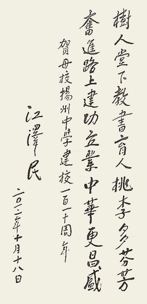 10月20日,江蘇省揚(yáng)州中學(xué)舉行建校110周年校慶慶祝大會(huì),數(shù)千名海內(nèi)外校友回校共慶母校華誕。江澤民同志專門(mén)為母校校慶題詞:“樹(shù)人堂下教書(shū)育人桃李多芬芳,奮進(jìn)路上建功立業(yè)中華更昌盛。”