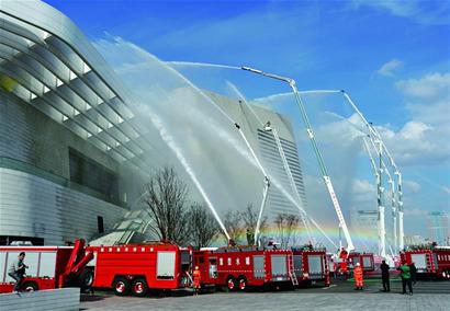 昨天上午10時30分,演練正式開始。險情假定青島大劇院一棟高層建筑因電線短路引發(fā)火災,火勢向其它樓層蔓延,樓內(nèi)大量人員被煙火圍困。發(fā)現(xiàn)火情后,會展中心有序組織被困人員利用疏散樓梯疏散,同時利用