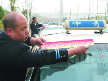 ????中青出租公司的出租車(chē)駕駛員們?cè)谲?chē)上統(tǒng)一張貼眉條,慶祝黨的十八大召開(kāi)。 記者 吳帥 攝