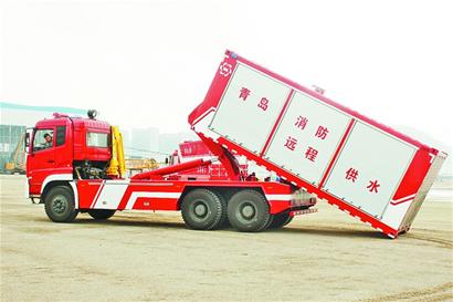 據(jù)介紹,該遠(yuǎn)程供水系統(tǒng)由5輛大型消防車,分為2輛供水泵車和3輛水帶自動鋪設(shè)車組成,可分成2個子系統(tǒng)使用,車上配有拖臂、吊臂和大功率供水泵站。該遠(yuǎn)程供水系統(tǒng)可