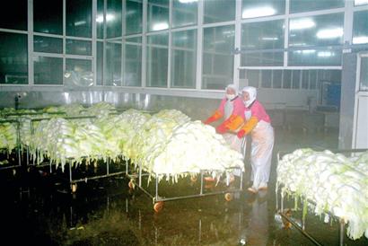 記者在車間看到,泡菜加工過程除白菜切割和包裝使用機器外,其它環(huán)節(jié)幾乎全靠人工,加工車間里有近200個工人同時工作,人工最密集的環(huán)節(jié)當屬涂抹醬料。在車間里,工人們必須用手撥開一層層白菜葉子,然后將醬料均勻的涂抹在每層葉片上,每個小組加工的泡菜還有專人記錄,以便進行質量跟蹤?!斑@個環(huán)節(jié)最容易出人工紕漏,一根頭發(fā)、一點雜質夾到白菜里,就會影響到整個企業(yè)的發(fā)展?!?/p>