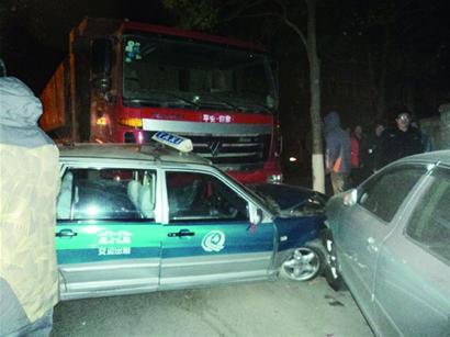 前天晚上9時(shí)30分左右,一輛滿載沙土的“斯太爾”自卸車在經(jīng)過臺(tái)西四路與臺(tái)西緯四路路口時(shí),與一輛出租車相撞后失控,頂著出租車撞上了停在路邊的轎車,巨大的慣性引發(fā)連環(huán)撞車事故,共有6輛停在路邊的車輛“破相”,出租車上的司機(jī)和乘客受輕傷,后被緊急送到醫(yī)院急救。