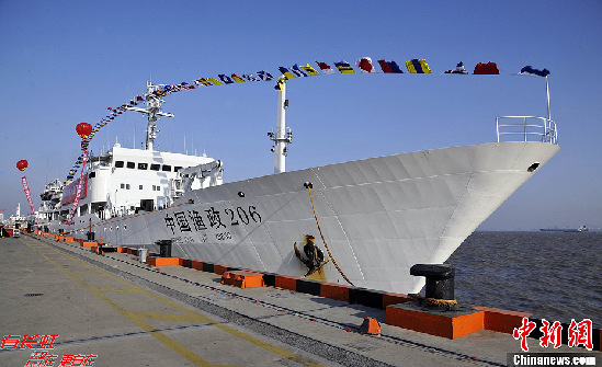 12月11日上午,一聲汽笛長鳴,在眾人目送中,中國目前最大漁政船“中國漁政206船”緩緩駛離中國極地考察國內(nèi)基地中心碼頭,踏上首航的征程,赴釣魚島海域執(zhí)行護(hù)漁維權(quán)任務(wù)。中國漁政206船,全長129.28米,滿載排水量5872噸,隸屬中國漁政東??傟?duì)。(中新社發(fā) 雪寒 攝)