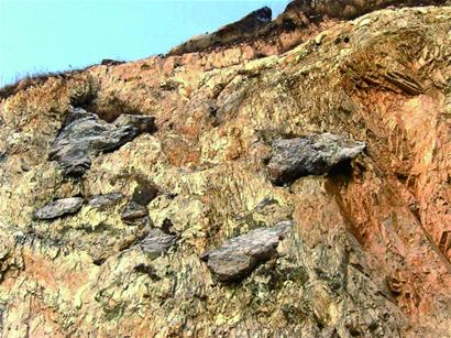 韓先生介紹,前天上午他回老家,閑著沒事,就爬上了離家十幾里的黃山經(jīng)濟區(qū)南山。爬到山頂?shù)臅r候,他看見一處懸崖,高約30多米,在石面上鑲嵌著很多奇形怪狀的灰黑色巖石,它們都呈薄片狀,厚度大約四五十厘米。有的像恐龍、有的像雄鷹、有的像烏龜,凸出在黃白色的石壁上。不遠處還有一處石筍,高約二三十米,孤零零地矗立在山溝中。