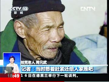 ????昨晚,記者得知中央電視臺新聞頻道《共同關(guān)注》欄目中播出了周元武老人的故事,還使用了本報記者劉海龍拍攝的圖片。當(dāng)記者將這個消息告訴老人時,他顯得特別意外?!罢鏇]干什么好事,撿了東西找失主還不是應(yīng)該干的,為這事還能上全國的電視?”周元武有些半信半疑。