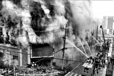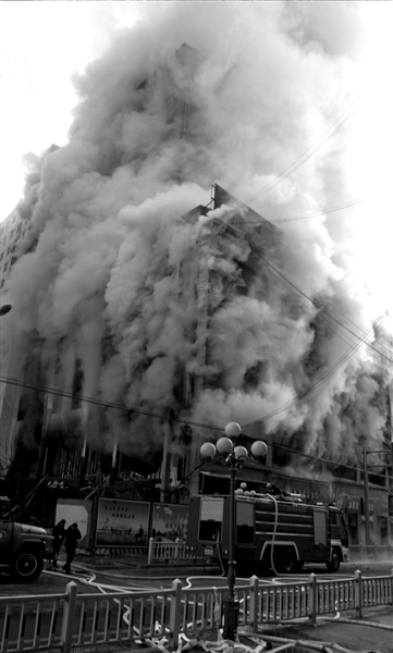 住在與失火大廈一街之隔的圣亞大酒店的何先生介紹,昨晨8時他起床后發(fā)現(xiàn),國貿(mào)大廈燃起大火,滾滾濃煙沖向空中。大廈1至8層均被大火殃及,不斷有明火從窗戶冒出。濃煙從大廈各窗口和通道沖出,煙柱高約百米。當時,大廈外滿是消防車、警車、急救車,消防隊員用水槍向國貿(mào)大廈猛噴,但效果甚微。由于天氣寒冷,大廈周圍的流水已經(jīng)結(jié)成冰。