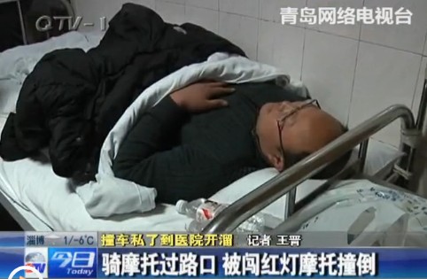 遭遇車禍被撞,就夠窩心的了,然而更讓人窩心的是,這肇事者把傷者送到醫(yī)院后竟然腳底抹油,溜了。即墨市民尹先生昨天就碰到了這么個(gè)不地道的司機(jī)。昨天下午四點(diǎn),記者在即墨市人民醫(yī)院的病房里見到了受傷的尹先生。尹先生告訴記者,事情發(fā)生在中午他下班的時(shí)候,當(dāng)時(shí)綠燈亮起,他騎著摩托車過馬路,卻被一輛闖紅燈的摩托車撞倒了。出事后,當(dāng)事人雙方的家人也很快趕到了現(xiàn)場,尹先生家人也報(bào)了警,當(dāng)著交警的面,雙方都簽