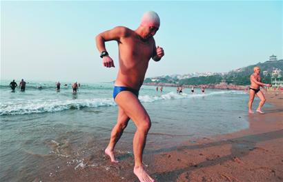 兩三分鐘后,首批下水的冬泳者開始上岸,10多分鐘后,大家陸續(xù)返回岸上,繼續(xù)鍛煉身體?!耙话愣菊呦滤褪?分鐘,能堅(jiān)持到10分鐘的就是高手了?!笔卸緟f(xié)會(huì)楊主席介紹。20多分鐘后,記者發(fā)現(xiàn)海里還有1個(gè)人沒(méi)有上來(lái),詢問(wèn)得知,那個(gè)人是聾人冬泳隊(duì)的樊景魁,今年已經(jīng)55歲?!袄戏苡伟雮€(gè)小時(shí),厲害啊。”沙灘上許多冬泳愛(ài)好者對(duì)老樊佩服有加。 (記者 趙健鵬)