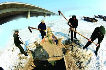 ????昨天上午,紅島邊防派出所民警來(lái)到碼頭,一路民警手持鐵鎬、鐵锨等工具,將船體周?chē)谋鶎哟蚱?,再清理掉貼在船底的冰凌,另一路民警來(lái)到養(yǎng)殖池,協(xié)助養(yǎng)殖戶破冰。