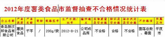 ??? 青島新漢邦食品有限公司的干芋(不合格項:菌落總數(shù)、霉菌)